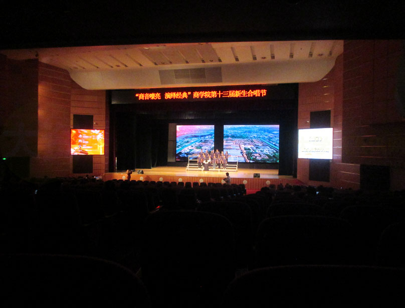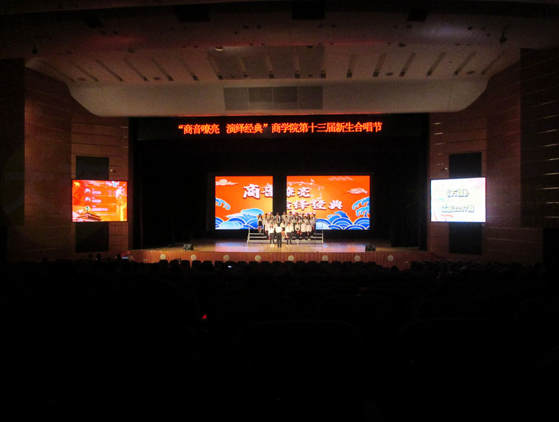 广外商学院第十三届新生合唱节今晚在教学区大会堂进行 先前预告的原本今晚是金融学院的迎新晚会在大会堂进行听说是推迟延期了 可能是大会堂太久没有进行活动晚会演出等,似乎屏幕也有些小不在状态
