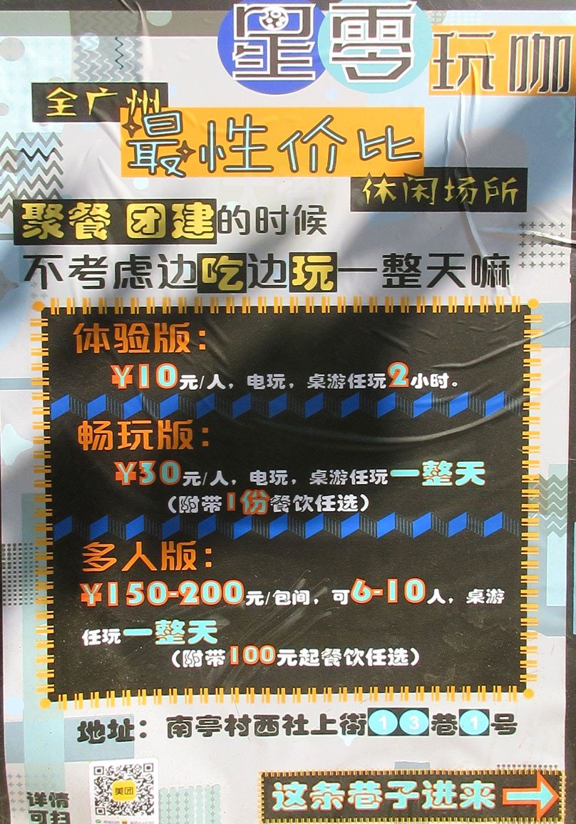 南亭村西社上街中 星零玩咖 全广州最性价比的休闲场所? 体验版:10元每人,电玩,桌游任玩2小时;畅玩版:30元每人,电玩,桌游任玩一整天(附带1份餐饮任选);多人版:150-200元一个包间,可6-10人,桌游任玩一整天(附带100元起餐饮任选) 详情可扫二维码咨询了解 |