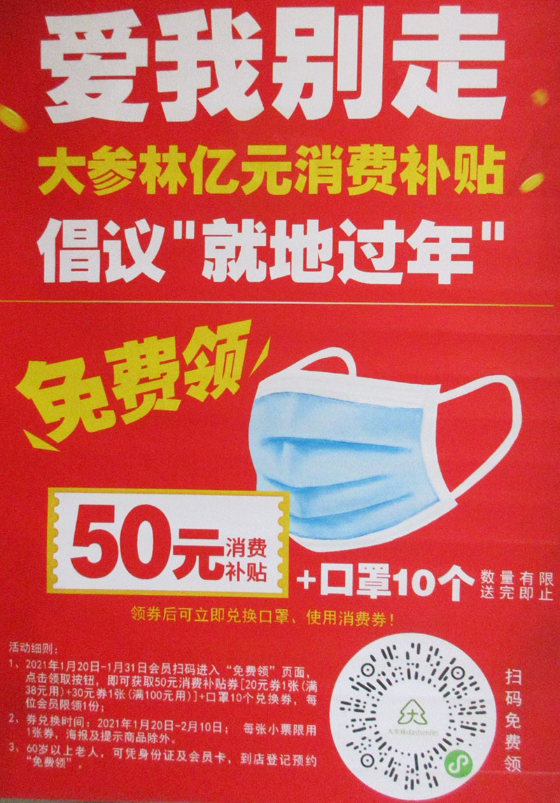 大参林亿元消费补贴免费领-具体50元消费券+口罩10个兑换券