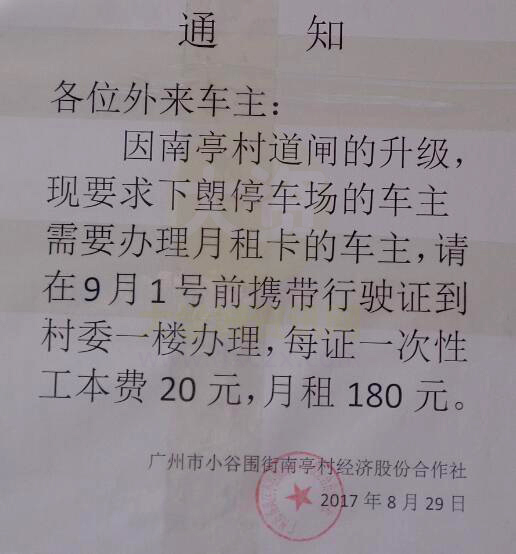 | 关于南亭村下朗停车场有需要办理月租卡的通知 | ||||||