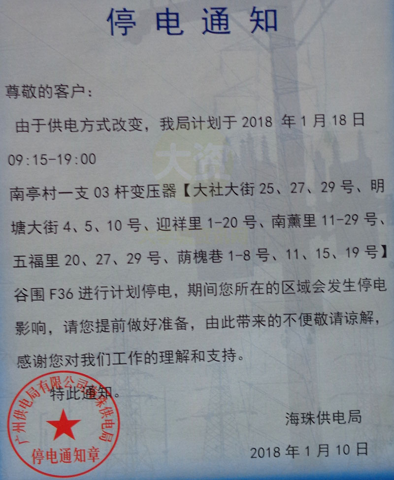 | 【停电通知】2018年1月18日 09:15-19:00 大社大街、明塘大街等 | ||||||