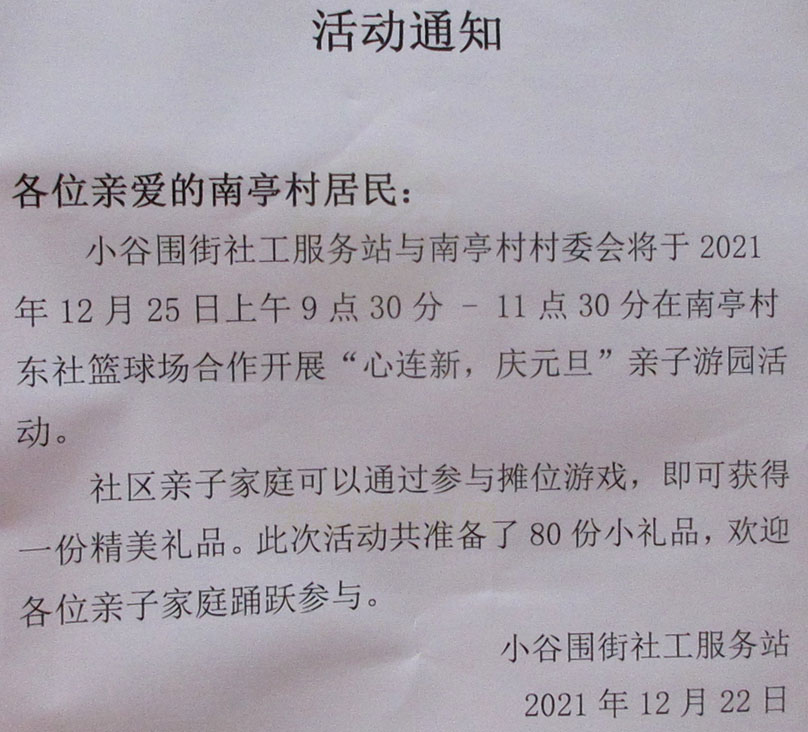 南亭 活动通知 “心连新,庆元旦”亲子游园活动 12月25日上午 南亭东社篮球场 |