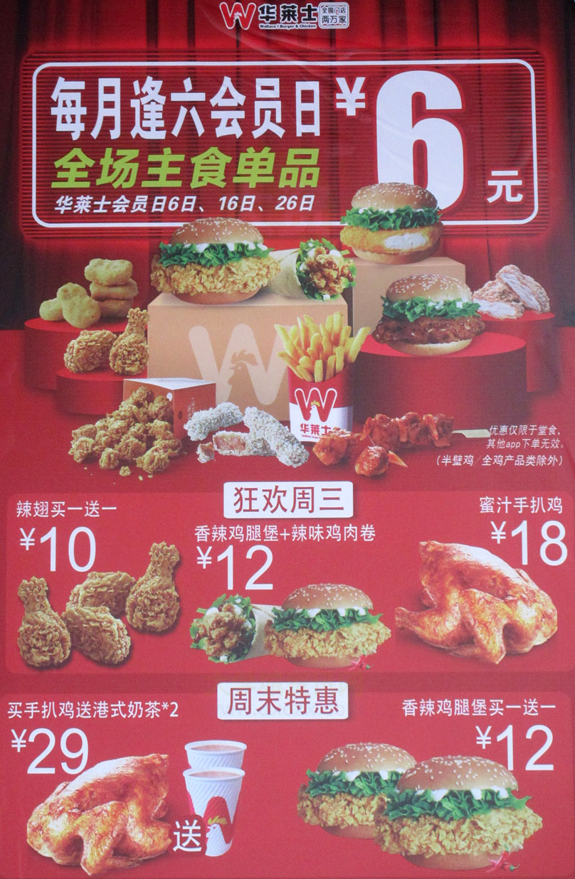 | 华莱士 每月逢六会员日 全场主食单品售价6元 狂欢周三(辣翅买一送一…) 周末特惠(20元买手扒鸡送…) | ||||||