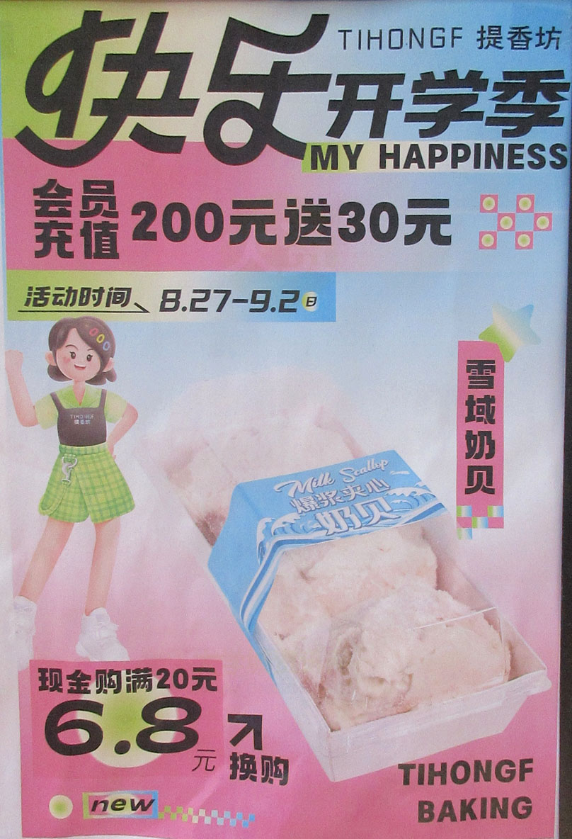 南亭大道中 提香坊 快乐开学季 会员充值200元送30元 活动时间8.27-9.2 另,现金购满20元,可6.8元换购雪域奶贝
