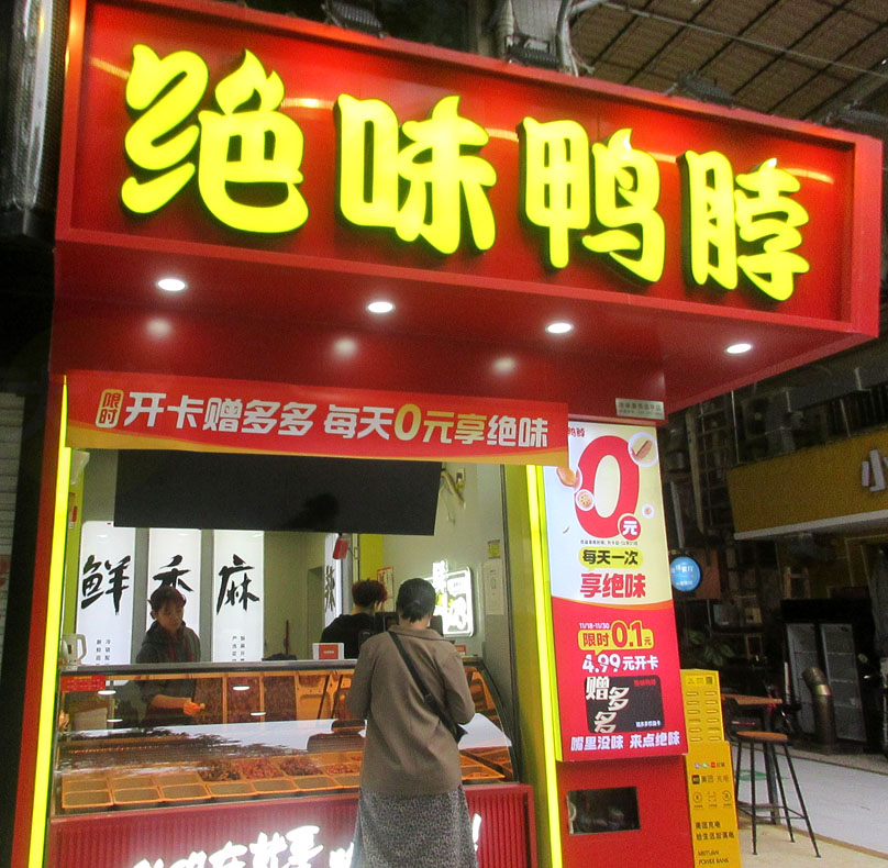 南商街十号楼西北角 绝味鸭脖 11.18-11.30限时0.1元开赠多多卡 权益享用时间:开卡日-12月31日 每天一次0元享绝味
