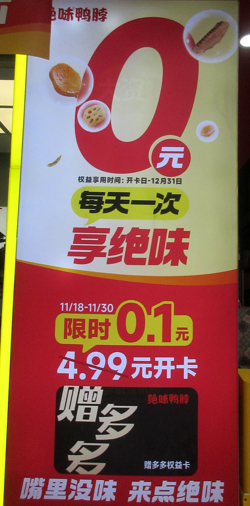 | 南商街十号楼西北角 绝味鸭脖 11.18-11.30限时0.1元开赠多多卡 权益享用时间:开卡日-12月31日 每天一次0元享绝味 | ||||||