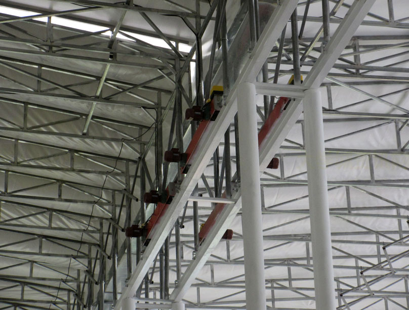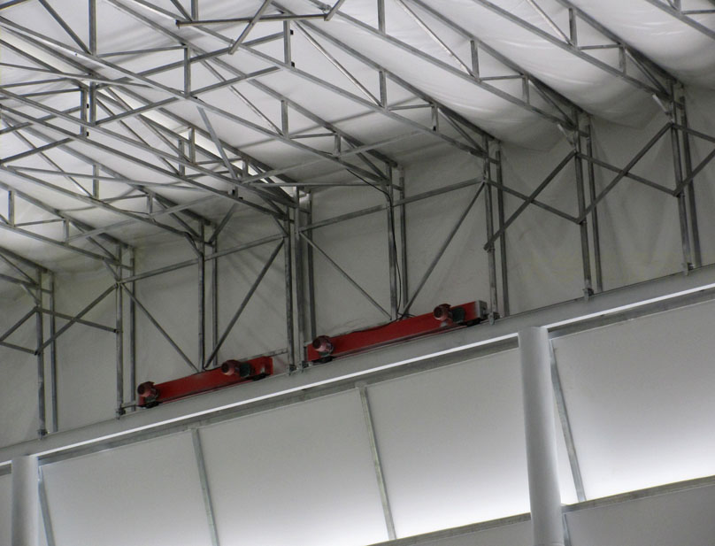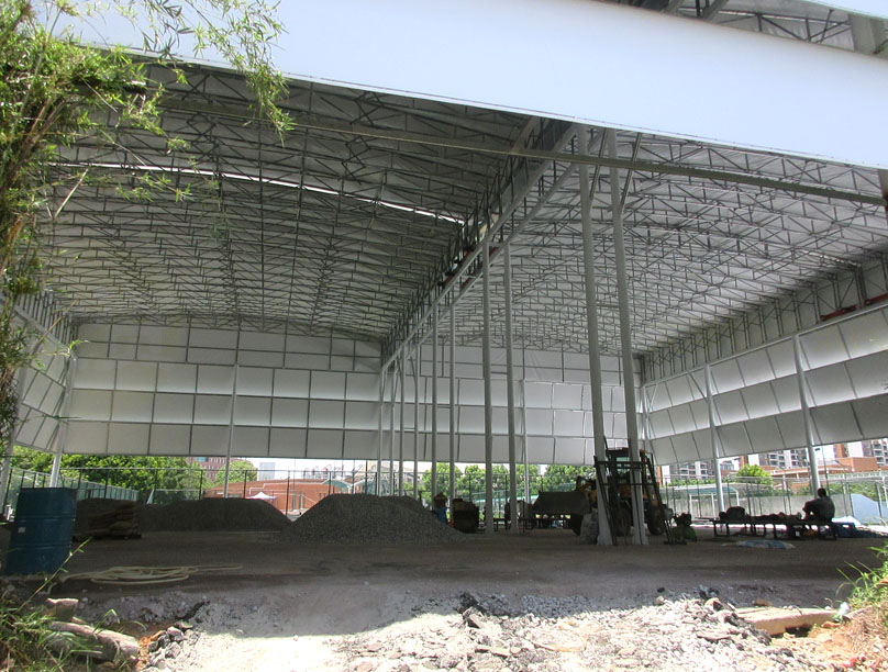 看着两个顶棚各两边的滑轮及构件,是不是有点不太经得起日常频繁的开合?所以这两个场弄好后,应该大多数情况下,都是会保持合上顶棚或敞开露天?按说应该会是前面合上的状态,不然还专门加个顶棚做啥,就是为了遮挡太阳或下雨等,毕竟广州5、6、7、8月份这样的夏天季节,那个晒是相当有热度的,所以里面晚上或较暗的时候,应该还要配上灯光照明吧;另外,看着,这种顶棚是帆布式的像,不知道遮挡风雨的经受程度几何,阳光耐晒程度几何,希望不会太容易出现漏水或损坏
